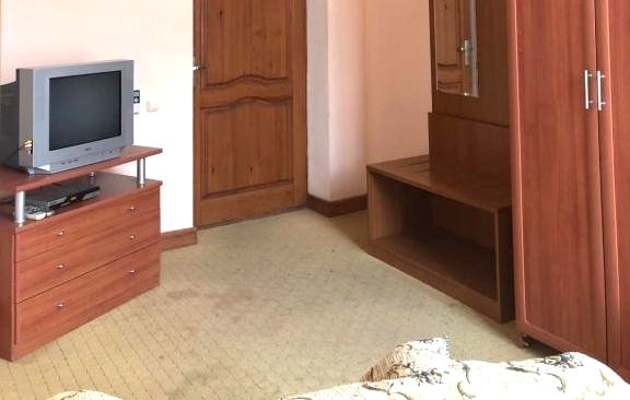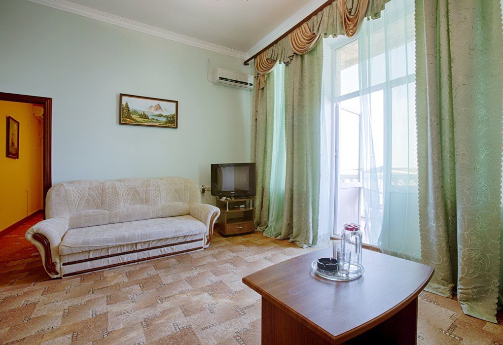 3 осн. места. Мебель: вешалка, зеркало, кровать двуспальная, кровать односпальная (или диван), прикроватные тумбочки, стол, стулья, шкаф. Оборудование: кондиционер, телевизор, холодильник. Санузел. Сервис: смена полотенец, смена постельного белья, уборка номера.